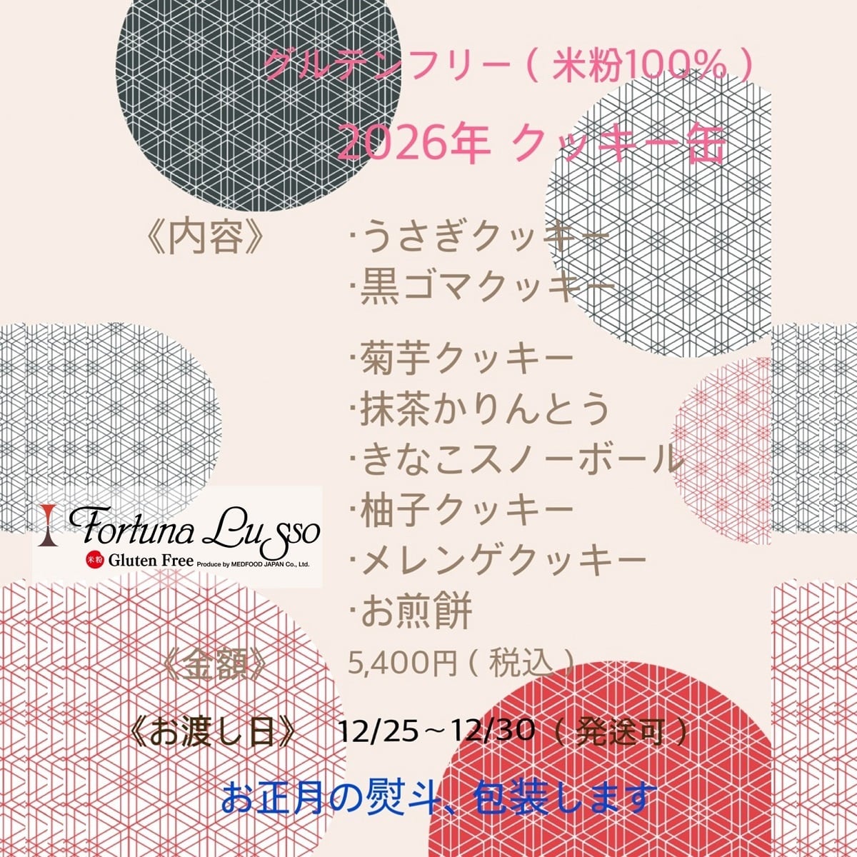 是非、年末年始のご挨拶など場に米粉Sweets&Cafe Fortuna Lussoの完全グルテンフリー(ノングルテンフリー)クッキー缶をご用命頂けたらと思います。